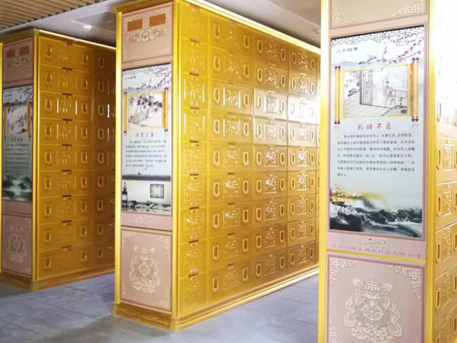 骨灰存放架是由箱體、面板、側板、頂蓋、底座、轉角、封板等構成,以及佛臺、掛落、佛龕等相關配件構成。