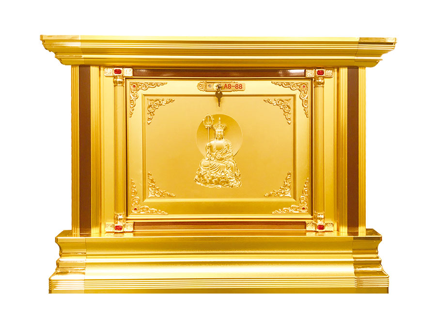 骨灰存放架是由箱體、面板、側板、頂蓋、底座、轉角、封板等構成,以及佛臺、掛落、佛 龕等相關配件構成。 箱體:分鍍鋅板、不銹鋼板、鋁板等五金板材箱體,鋁合金中空板扣接式箱體和純鋁壓鑄型 箱體。 面板:面板根據工藝不同、材料不同,風格各異、大不相同,既要起到美觀易分類作用,又 要起到防火、防塵、防潮、防蟲等作用。 側板:用于裝飾和保護箱體側面的作用,又可根據現場,對存放架分類的標識作用,一目了 然方便管理。 頂蓋、底座:都是穩固整列和整排箱體水平線,底座還起到一部分承重作用。 轉角、封板:箱體轉彎處和空隙處塑形的作用。 佛臺:由幾個骨灰存放架組成一個小型佛龕臺,用于放置佛像。 佛龕、掛落:整排存放架為了劃分區域,在每個區域靠墻上方,設置小型佛龕,為了美觀, 加上掛落。